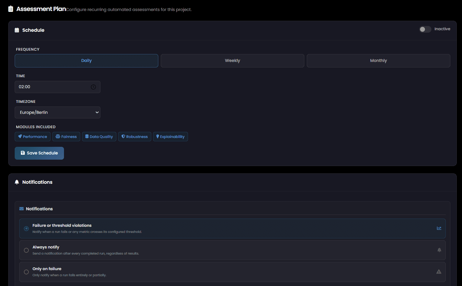 Continuous monitoring with alerts when metrics drift, performance degrades, or fairness thresholds are breached.